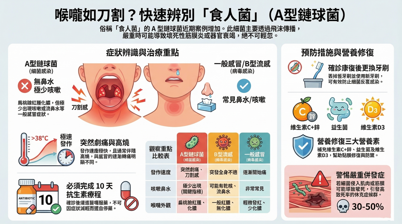 醫學實證分析:為什麼「沒咳嗽」反而是警訊? 醫師指出,A 型鏈球菌是一種細菌感染,它會集中火力攻擊喉嚨粘膜。當患者出現劇烈喉嚨痛、高燒,卻幾乎沒有感冒常見的咳嗽或流鼻水時,這正是細菌正在侵蝕粘膜的紅色警報。