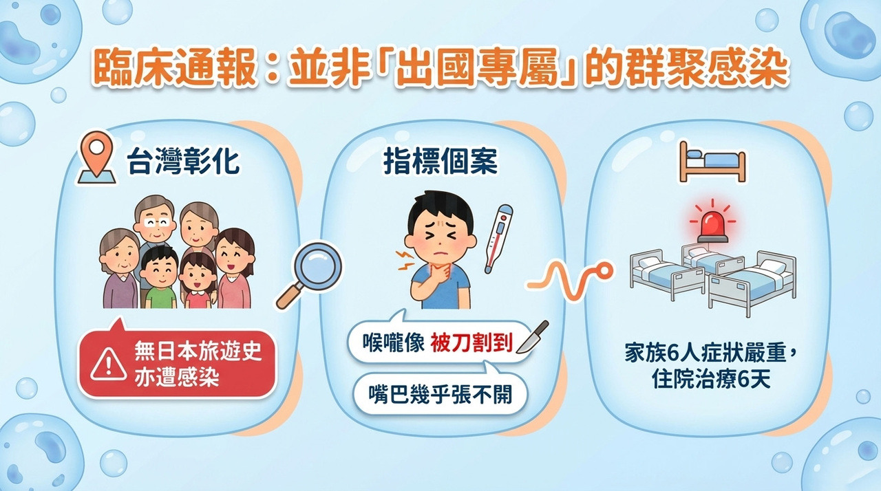 這並非一般的感冒,而是近期在日本引發大流行、俗稱「食人菌」的 A 型鏈球菌。最令人震驚的是,吳女士一家近期完全沒有出國史,卻發生了 8 人集體感染的慘劇,其中 6 人甚至因為病況危急必須住院治療。這打破了「不出國就沒事」的迷思,警示著這致命細菌可能就在我們日常生活的呼吸之間。