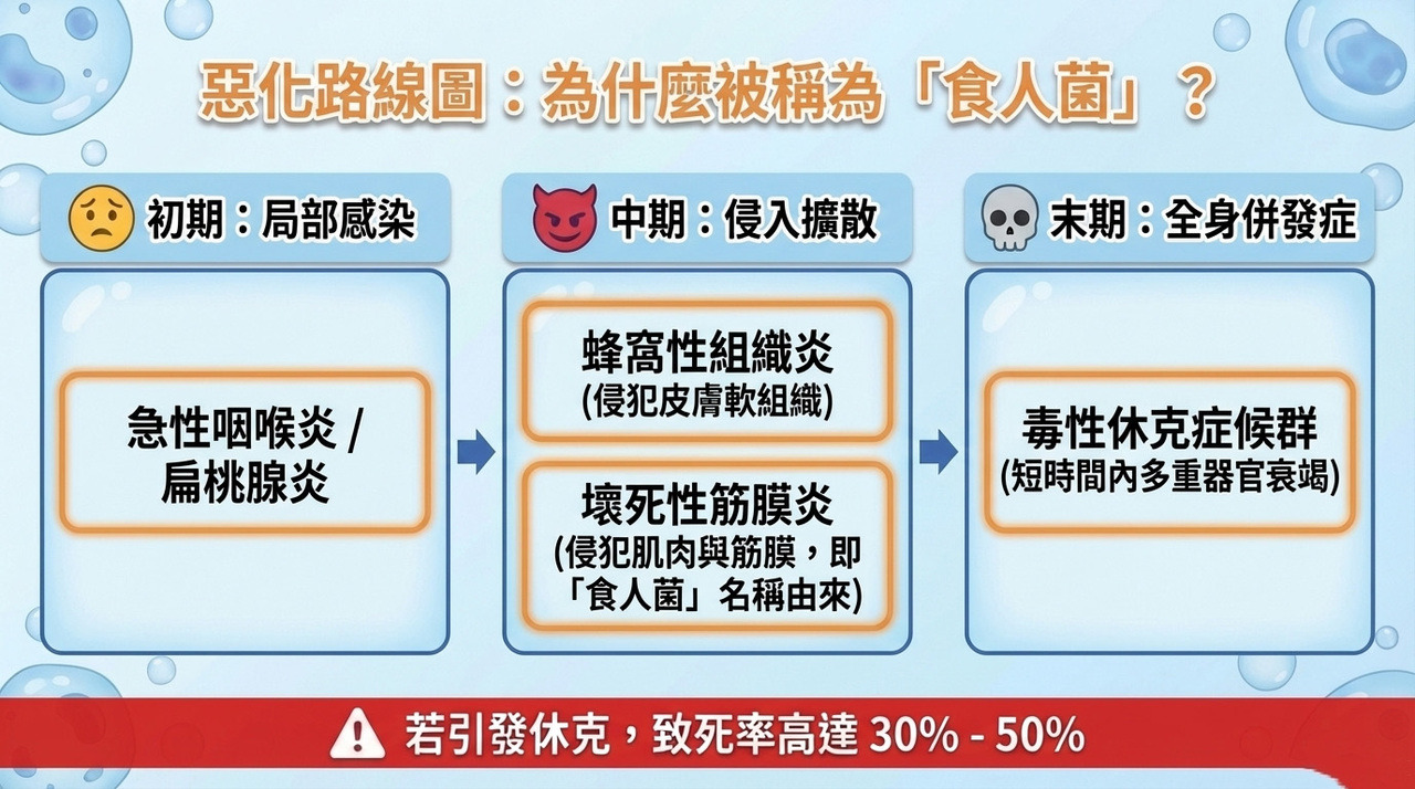 - 極高死亡率: 若演變成毒性休克症候群(STSS),死亡率高達 30% 至 50%。