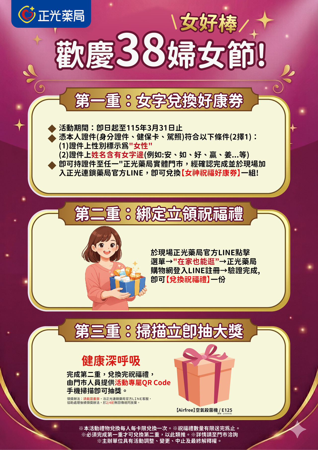 即可持證件至任一"正光藥局實體門市,經確認完成並於現場加入正光連鎖藥局官方LINE,即可兌換【女神祝福好康券】一組!