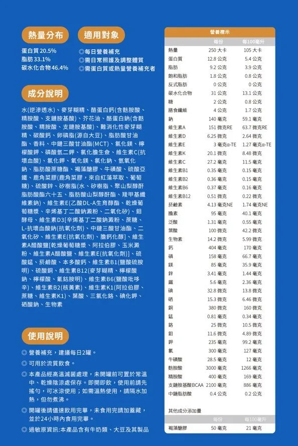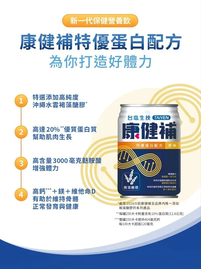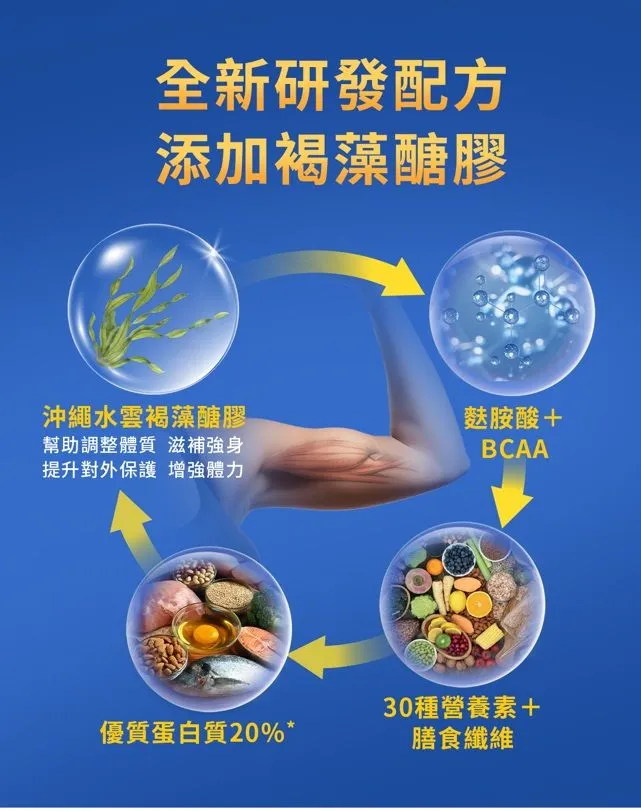 添加50毫克褐藻醣膠添加沖繩水雲褐藻醣膠 20% *優質蛋白質 3000毫克麩胺酸,增強體力
