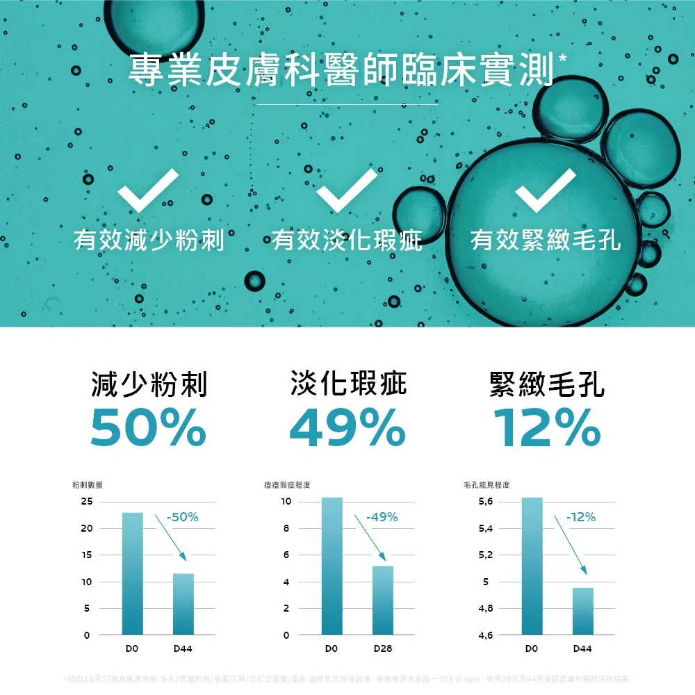 • *臨床證實:有效減少粉刺50%,緊緻毛孔12%,淡化瑕疵49%