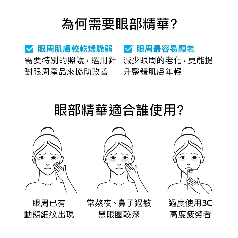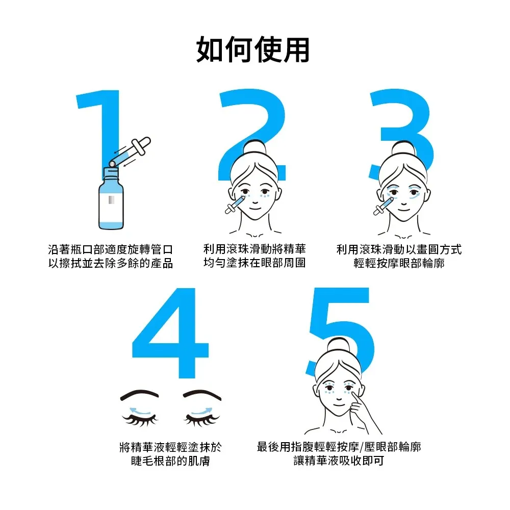 用法:每日早晚清潔與使用化妝水後,取適量以滾珠滑動將精華液塗抹於眼周肌膚。