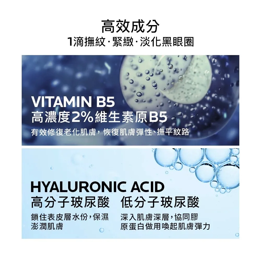 含維生素原B5能有效抗老。添加玻尿酸**,不只鎖住肌膚水分,更能滲透肌底,緊緻眼周肌膚並恢復肌膚彈性,重現年輕。