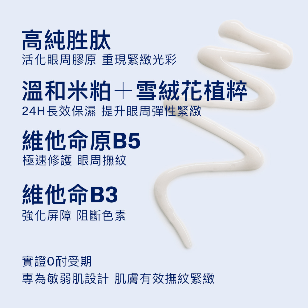24小時長效保濕:緩解乾燥眼周,添加維他命B3、B5、玻尿酸深層保濕、修護肌膚屏障