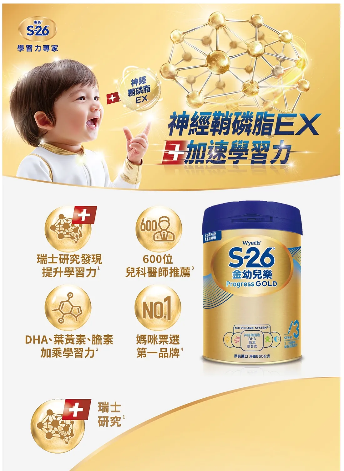 【Wyeth惠氏】S-26 金幼兒樂HMO幼兒成長配方 (850g)